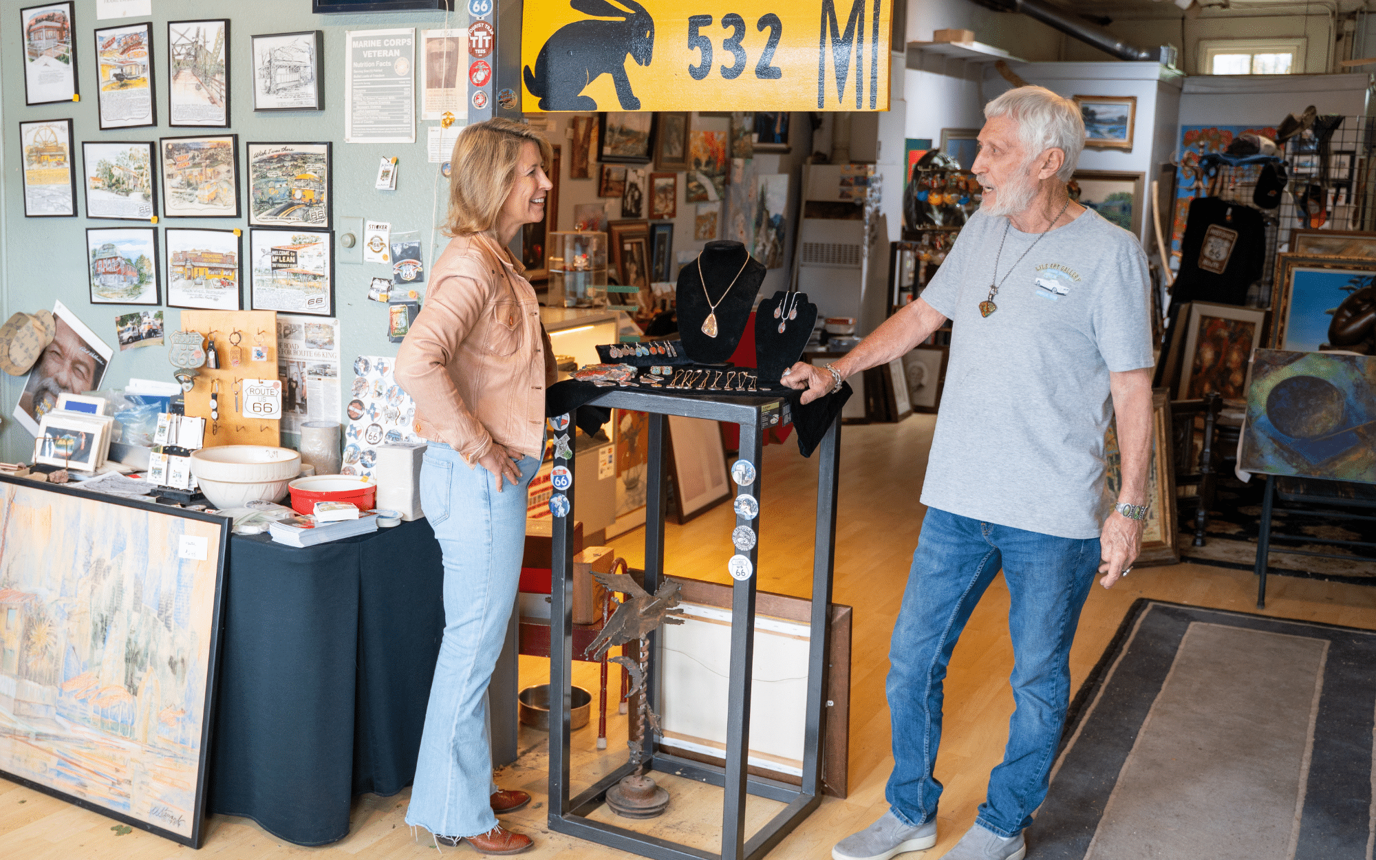 If you continue along the Texas leg of Route 66, you’ll come to Amarillo. When you reach the city’s historic district, be sure to stop at Lile Art Gallery for some of the most creative jewelry I’ve seen yet – Cadilite jewelry. Bob “Crocodile” Lile uses the spray paint that chips off cars at the nearby Cadillac Ranch and turns them into colorful creations.