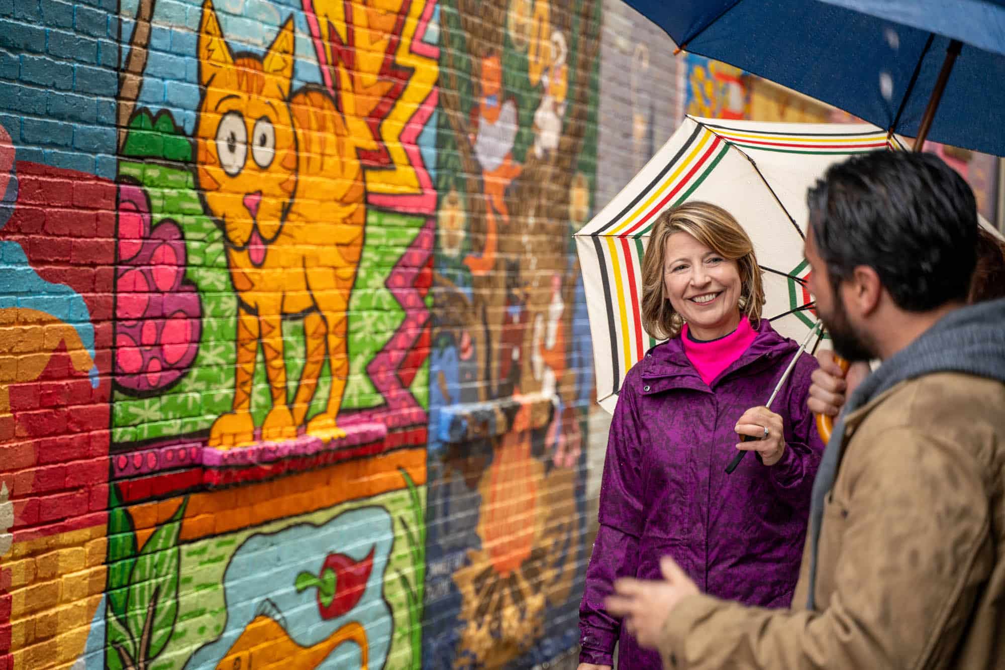 Alright, cat lovers, this spot is for you. While you probably won’t see any stray felines roaming about Cat Alley, you will see a series of beautiful murals and motifs that all have one common theme – cats! One of the muralists, Dave Hady, as well as the metalsmith responsible for the cat bike racks, Vivian Beer, led me down the alley while we discussed how this project came to be and why public art is so important.